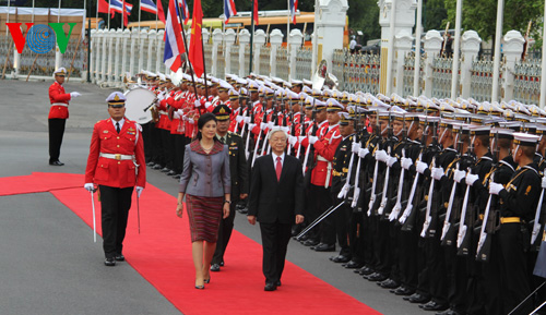 | ท่านเหงวียนฟู้จ่อง เลขาธิการใหญ่พรรคคอมมิวนิสต์เวียดนามและนางสาวยิ่งลักษณ์ ชินวัตร นายกรัฐมนตรีไทยตรวจแถวกองเกียรติยศของไทย (VOV ) |