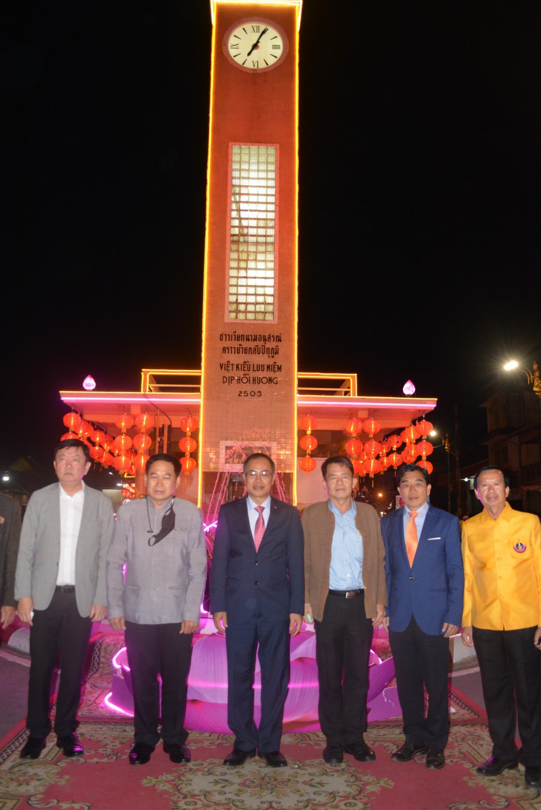 เอกอัครราชทูตเวียดนามประจำประเทศไทย ฟานชี้แถ่งและบรรดาผู้บริหารจังหวัดนครพนมและสมาคมไทย-เวียดนามในจังหวัดนครพนมถ่ายภาพกับหอนาฬิกาเวียดนามอนุสรณ์ (Photo: สมาคมไทย-เวียดนามในจังหวัดนครพนม) |