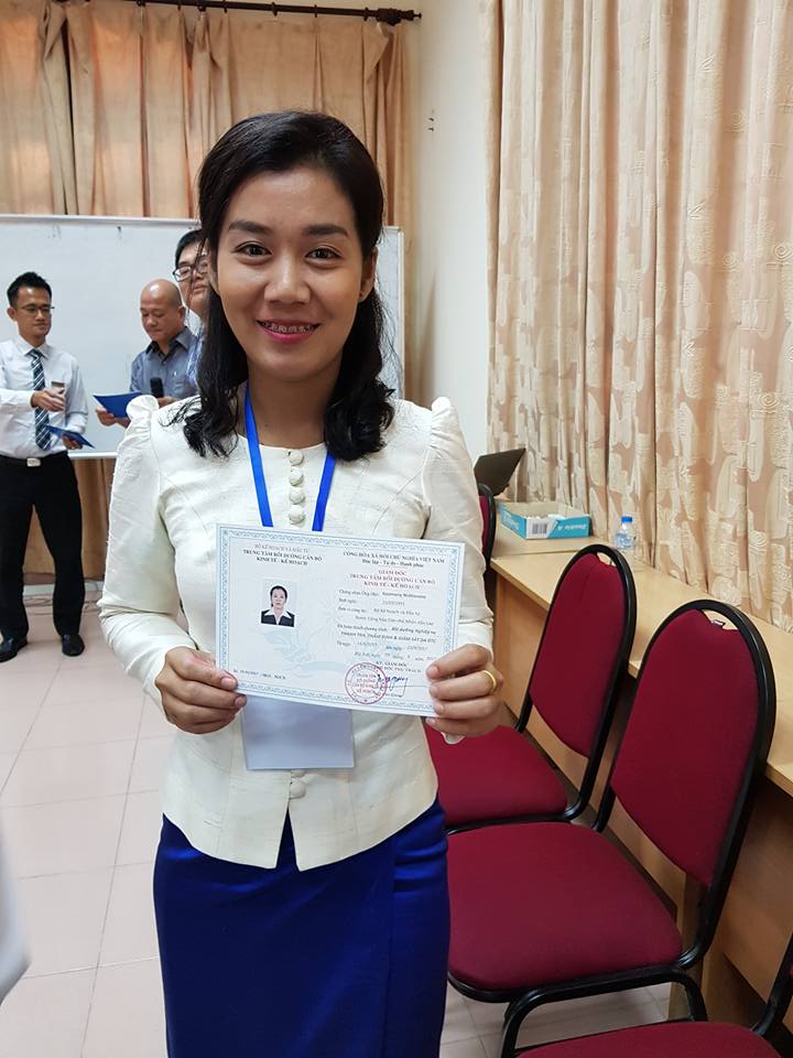 เมื่อเสร็จพิธีมอบใบรับรอง “การฝึกอบรมทักษะวิชาชีพด้านการตรวจตรา ตรวจสอบโครงการลงทุนภาครัฐ” คุณ นิตสะวอน แก้วมะนี อายุ 26 ปี ซึ่งมีอายุน้อยที่สุดในกลุ่มผู้เข้าร่วมการฝึกอบรมเจ้าหน้าที่ข้าราชการชาวลาวรวม 20 คนได้แสดงความยินดีเป็นอย่างมาก โดยเธอใส่ชุดเสื้อผ้าไหมแขนยาวสีขาว ผ้าซิ่นสีน้ำเงินแบบลาว กำลังถ่ายรูปหมู่กับสมาชิกที่เข้าร่วมการฝึกอบรม นี่คือครั้งแรกที่คุณ นิตสะวอน แก้วมะนี เข้าร่วมการฝึกอบรมในต่างประเทศนับตั้งแต่เข้าทำงานในคณะกรรมการตรวจสอบของกระทรวงวางแผนและการลงทุนลาวเมื่อ 4 ปีก่อน “ในการเข้าร่วมฝึกอบรมที่มีขึ้นเป็นเวลากว่า 1 เดือน นอกจากได้เพิ่มความรู้เกี่ยวกับทักษะวิชาชีพแล้ว โดยเฉพาะงานด้านการตรวจตราและตรวจสอบโครงการลงทุนภาครัฐ พวกเรายังได้ไปทัศนศึกษาใน 5 จังหวัดของเวียดนาม เช่นห่านาม นามดิ่ง หว่าบิ่ง บั๊กนิงและหวิงฟุก จากการเข้าร่วมการฝึกอบรมนี้ พวกเราเห็นว่า เวียดนามมอบหมายหน้าที่การทำงานอย่างละเอียด ดังนั้นทุกสิ่งทุกอย่างจึงได้รับการแก้ไขอย่างรวดเร็ว นี่คือสิ่งที่เป็นประโยชน์ที่ดิฉันได้เรียนรู้จากการเข้าร่วมการฝึกอบรมนี้”