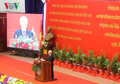 การพูดคุยของท่านเลขาธิการใหญ่พรรคคอมมิวนิสต์เวียดนาม ณ มหาวิทยาลัยแห่งชาติลาวได้ให้กำลังใจแก่ผู้ฟัง โดยเฉพาะคนรุ่นใหม่ของทั้งสองประเทศ ท่าน เหงียนฟู้จ่อง ได้ย้ำว่า ในโลกที่มีการผันผวนอย่างซับซ้อนในปัจจุบัน ความสัมพันธ์ความสามัคคีพิเศษเวียดนาม-ลาวมีความสำคัญยิ่งกว่าเวลาใดทั้งหมดต่อทั้งสองฝ่าย และเชื่อมั่นว่า คนรุ่นใหม่ของทั้งสองประเทศจะรักษา ทำนุบำรุงและส่งเสริมสมบัติอันล้ำค่าของความสัมพันธ์ที่ซื่อสัตย์และบริสุทธิ์เวียดนาม-ลาว.