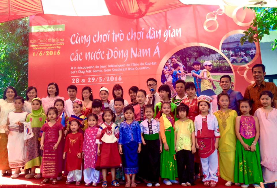 เขตที่จัด“การละเล่นพื้นเมืองของประเทศอาเซียน”อยู่ห่างจากเวทีการแสดงชุดประจำชาติของประเทศอาเซียนไม่ไกลนัก โดยคณะกรรมการจัดงานได้จัดการละเล่นต่างๆ เช่น หมากขุมแบบเวียดนามและมาเลเซียและชักเย่อของไทย เป็นต้น ทางด้านซ้ายของลานมีกลุ่มนักศึกษา๓คนกำลังเล่นหมากขุม ซึ่งเป็นการละเล่นของเด็กๆเวียดนามในสมัยก่อน โดยมีอุปกรณ์การเล่นได้แก่กระดานที่จากกระดาษปกแข็งที่แบ่งเป็น๑๒หลุมและก้อนกรวดสีขาวหลายสิบก้อน ขณะที่นักศึกษาคนอื่นๆก็กำลังเล่นคองกัก ซึ่งเป็นการละเล่นพื้นเมืองของมาเลเซียที่คล้ายกับหมากขุมของเวียดนาม โดยกระดานแบ่งเป็น๑๔หลุมและจำนวนก้อนกรวดในแต่ละหลุมก็แตกต่างกัน ซึ่งการละเล่นดังกล่าวมีจุดที่แตกต่างกันตามคำแนะนำของนาย Mohd Qa Shairi นักศึกษาชาวมาเลเซียว่า“ผมรู้สึกดีใจเป็นอย่างมากที่มีโอกาสแนะนำการเล่นคองกักให้แก่เพื่อนมิตรชาวเวียดนาม กระดานของพวกเราทำจากไม้ ส่วนกระดานในการเล่นหมากขุมของเวียดนามทำจากกระดาษ คนเวียดนามใช้ก้อนกรวดเพื่อเล่นหมากขุม ส่วนพวกเราใช้ลูกแก้วเพื่อเล่นคองกัก”