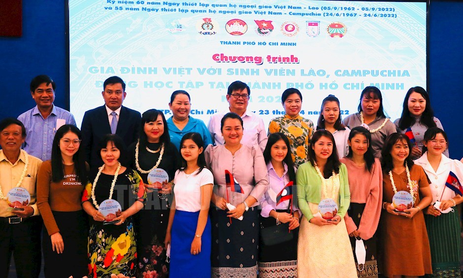 นักศึกษาชาวลาวและกัมพูชาพร้อมพ่อแม่อุปถัมภ์เข้าร่วมงานฉลองครบรอบ 60 ปีการสถาปนาความสัมพันธ์ทางการทูตเวียดนาม-ลาว และ 55 ปีการสถาปนาความสัมพันธ์ทางการทูตเวียดนาม-กัมพูชา เมื่อเดือนเมษายนปี 2022 ณ นครโฮจิมินห์ |
