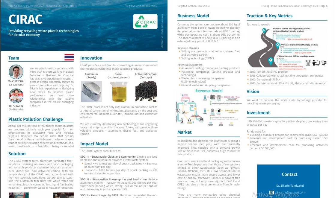 “กลุ่ม CIRAC ได้เสนอเทคโนโลยีที่ recycle ขยะพลาสติกตามรูปแบบเศรษฐกิจหมุนเวียนอย่างมีประสิทธิภาพ โดยจุดใหม่ของเทคโนโลยีนี้คือนอกจากการเก็บและrecycle ขยะพลาสติกผ่านกระบวนการเปลี่ยนขยะบรรจุภัณฑ์ฟิล์มอ่อนตัวหลายชั้นเป็นอลูมิเนียมเเละน้ำมันเชื้อเพลิงแล้ว ยังสามารถสร้างมูลค่าเพิ่มมากกว่าการrecycle ขยะพลาสติกให้เป็นเม็ดพลาสติกเพราะประเทศไทยกำลังต้องนำเข้าอลูมิเนียมจำนวนมาก ซึ่งเทคโนโลยีนี้จะช่วยส่งเสริมการเก็บและrecycle ขยะพลาสติก มีส่วนร่วมแก้ไขปัญหาขยะพลาสติก รวมทั้งขยะพลาสติกทางทะเล”