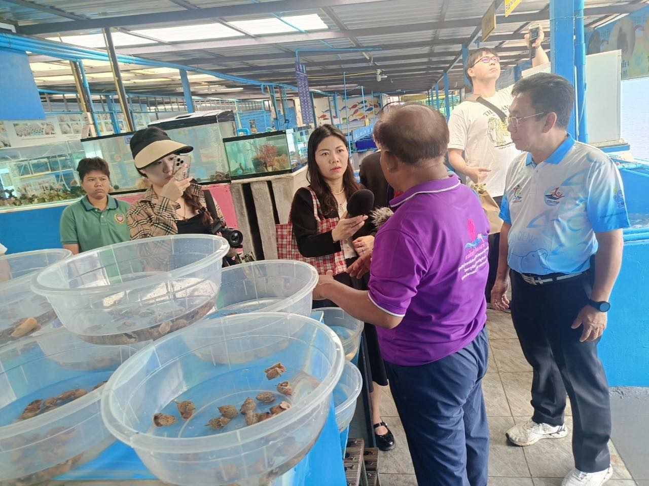 นางสาว หทัยมาศ วรรณ์รัตน์ ผู้ช่วยนักวิจัยที่ศูนย์เรียนรู้ธนาคารสัตว์ทะเลเกาะสีชังแนะนำวิธีการปลูกหอยหวาน |