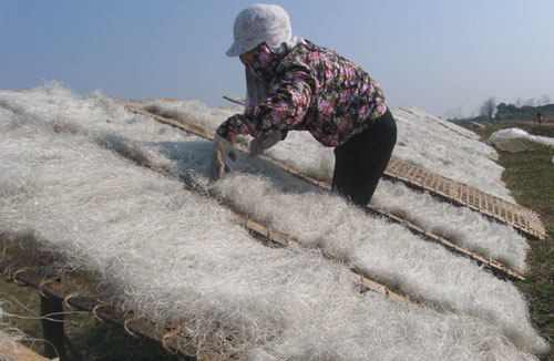นอกจากอาชีพทำขนมข้าวต้มมัดใหญ่ การทำวุ้นเส้นก็คืออาชีพหลักของชาวบ้าน อาชีพทำวุ้นเส้นสร้างรายได้ค่อนข้างสูง ดังนั้นหลายครอบครัวจึงผลิตวุ้นเส้นตลอดปี ปริมาณการผลิตอยู่ที่ประมาณ 2 ตันต่อวัน ในหลายปีมานี้ วุ้นเส้นหมู่บ้านเดิ่มยังได้รับการส่งออกไปยังประเทศลาว กัมพูชาและไทย คุณ เหงียนถิเฝื่อง ชาวบ้านของหมู่บ้านเดิ่มได้เผยว่า “ชาวบ้านได้ประกอบอาชีพทำขนมข้าวต้มมัดใหญ่มานานแล้ว ปัจจุบัน ชาวบ้านประกอบหลายอาชีพ โดยไม่เพียงแต่ประกอบอาชีพทำขนมข้าวต้มมัดใหญ่เพื่ออนุรักษ์อาชีพพื้นเมืองของบรรพบุรุษเท่านั้น พวกเรายังประกอบอาชีพทำเต้าหู้ เส้นก๋วยเตี๋ยวและแบ๊งไหย่ เป็นต้น”