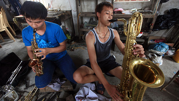 ไม่เพียงแต่เล่นแตรอย่างคล่องแคล่ว ชาวบ้านฝ่ามฟ้าวยังมีเทคนิคซ่อมแตร อันเป็นก้าวเดินไปสู่การเลียนแบบทำแตรและค่อยๆพัฒานอาชีพทำแตรทองเหลืองในหมู่บ้านเกษตรกรรม