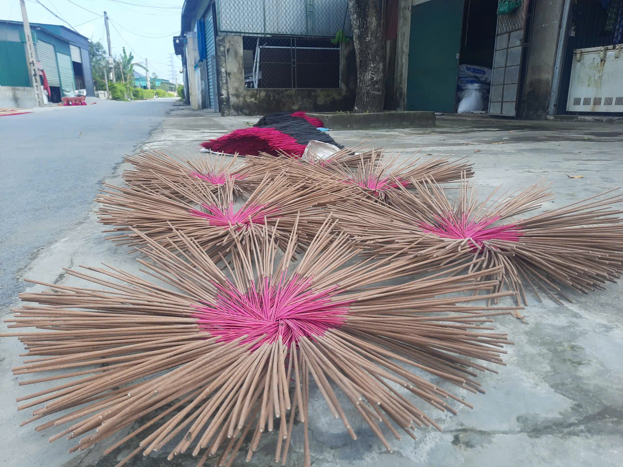 มัดธูปสีแดงที่วางเรียงรายบริเวณถนนและลานหน้าบ้าน |