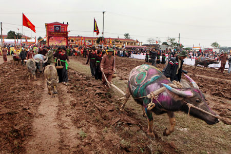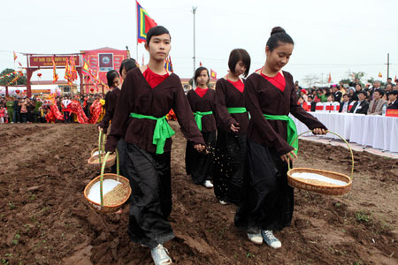 หนังสือประวัติศาสตร์เวียดนามระบุว่า เมื่อปีค.ศ. ๙๘๗ รัชกาลเทียนฟุกที่ ๗ กษัตริย์เลด่ายแห่งทรงเลือกจัดพระราชพิธีจรดพระนังคัลแรกนาขวัญครั้งแรกขึ้น ณ เชิงเขาด่อย ตำบลด่อยเซิน อำเภอซุยเตียน จังหวัดห่านาม อันเป็นการเปิดประวัติศาสตร์การปลูกข้าวนาดำหน้าใหม่และประเพณีอันดีงามของชาติให้รัชกาลต่อๆไปสืบทอด โดยทุกๆต้นฤดูใบไม้ผลิ พระองค์ทรงทำพิธีบนบานขอให้ฝนฟ้าตกต้องตามฤดูกาล การเก็บเกี่ยวได้ผลดี ณ เชิงเขาด่อย ต่อจากนั้นท่านจะทรงไถนาเป็นคนแรกอันเป็นการเริ่มต้นฤดูปลูกข้าวใหม่ ตั้งแต่นั้นมา ประเพณีอันสำคัญนี้ของชาติได้รับการสืบทอดกันมาราชวงศ์แล้วราชวงศ์เล่าไม่ว่าจะเป็ราชวงศ์หลี เจิ่น เลหรือเหงวียนจนถึงปัจจุบัน