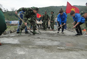 ![]() ทหารและประชาชนบนเกาะโกโตร่วมกันก่อสร้างถนน