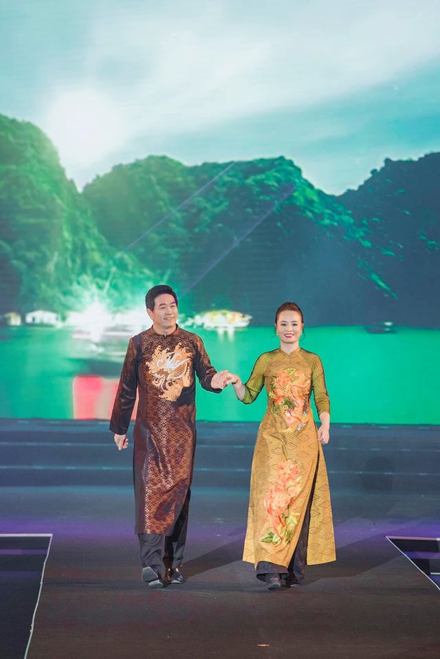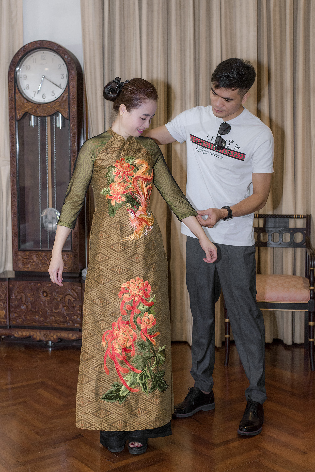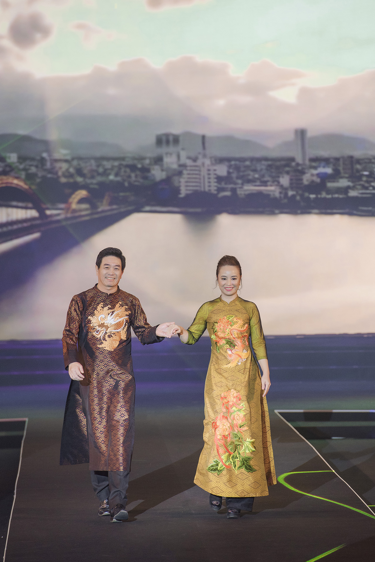 นาย เหงวียนหายบั่ง เอกอัครราชทูตเวียดนามประจำประเทศไทยพร้อมภริยาได้ใส่ชุดอ๊าวหย่ายลายมังกรและหงส์ของนักออกแบบหวูเหวียดห่าเพื่อสื่อถึงความรุ่งเรืองและความเจริญไพบูลย์ |