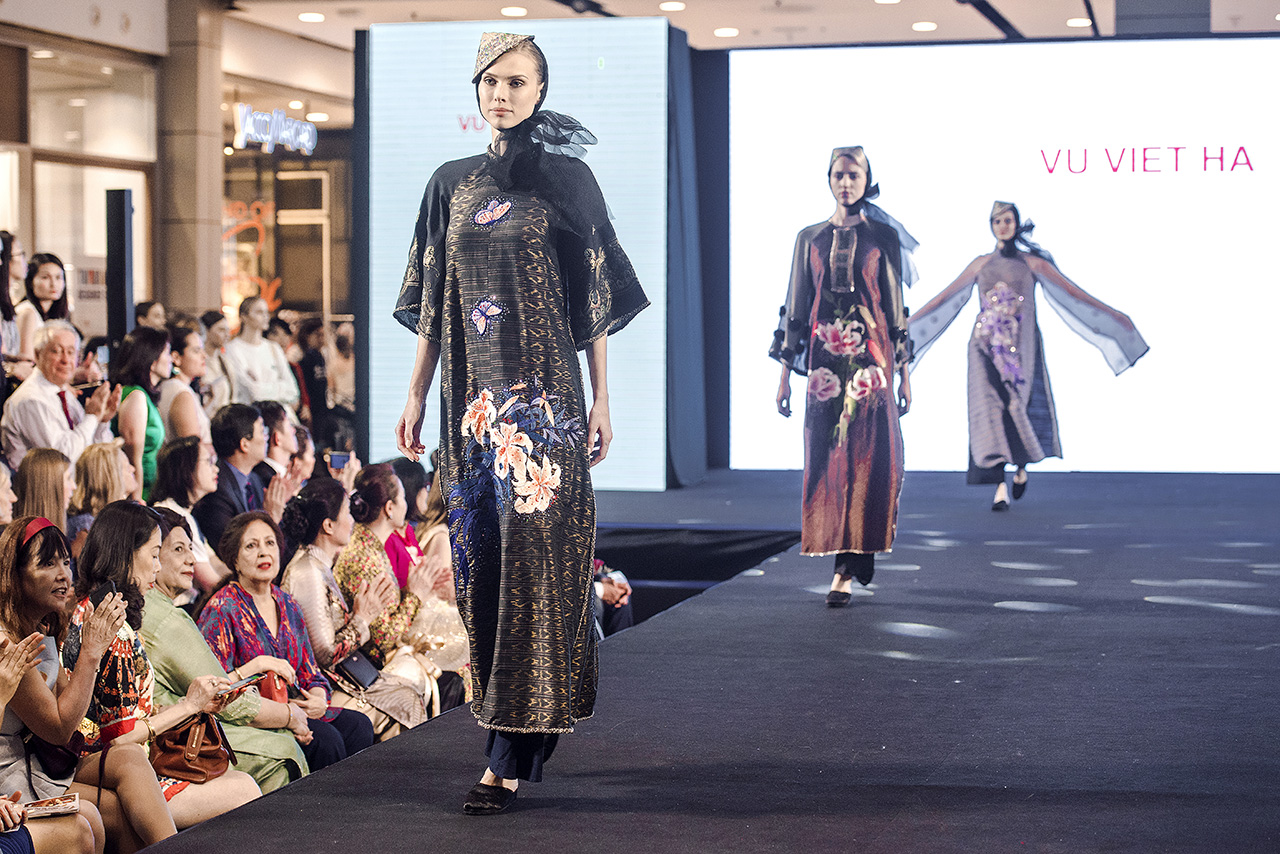 เอกอัครราชทูตเวียดนามพร้อมภริยาเดินแบบโชว์ความงามที่เป็นเอกลักษณ์ของชุดอ๊าวหย่ายเวียดนามบนเวทีงานมหกรรมผ้าไหมไทย 2562 |