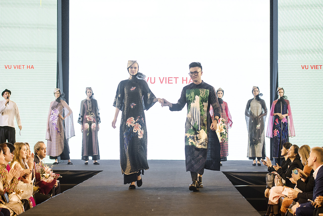 นักออกแบบเวียดนาม หวูเหวียดฮา กับชุดไหมไทยที่ตัวเองออกแบบ |