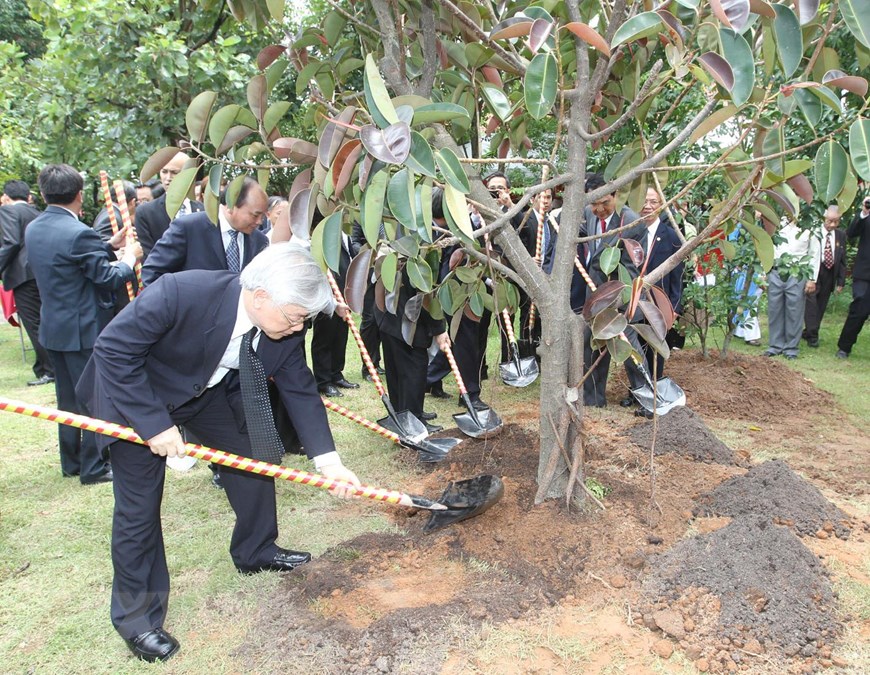 เลขาธิการใหญ่พรรคคอมมิวนิสต์เวียดนามเหงวียนฟู้จ๋องปลูกต้นไม้เป็นที่ระลึก ณ หมู่บ้านมิตรภาพไทย-เวียดนามที่จังหวัดนครพนมในกรอบการเยือนไทย ปี2013 (ภาพ: Trí Dũng/TTXVN) |