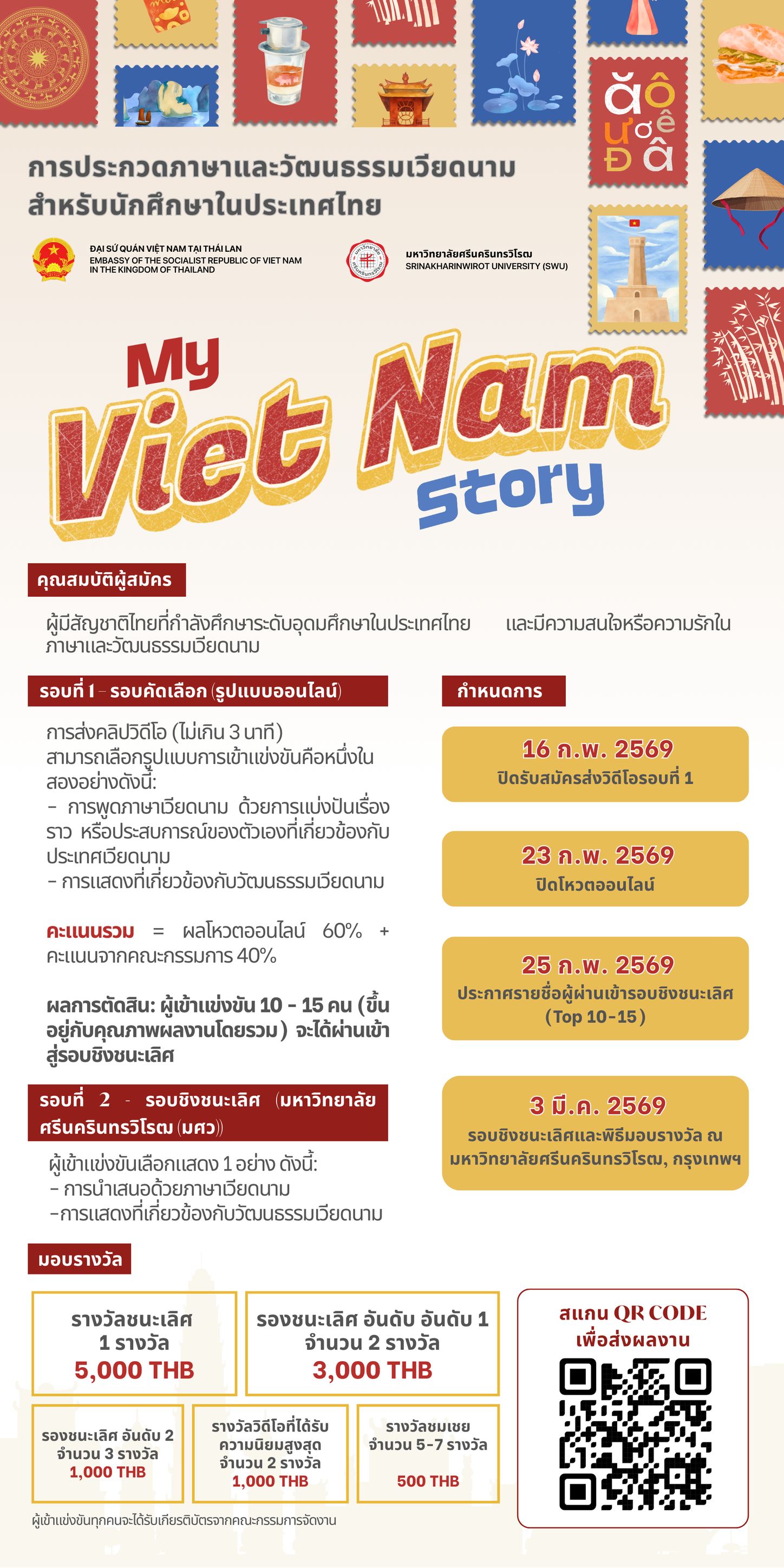 สมัครเข้าร่วมโครงการ My Viet Nam Story วันนี้! เพื่อได้รับรางวัลพิเศษมากมายและโอกาสในการแลกเปลี่ยน แสดงความสามารถ พร้อมร่วมการเผยแพร่ความรักที่มีต่อภาษาและวัฒนธรรมเวียดนาม