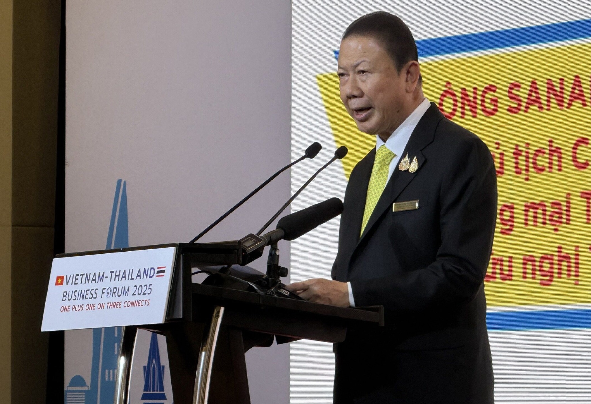 นายสนั่น อังอุบลกุล ประธานกรรมการอาวุโสของหอการค้าไทยและสภาหอการค้าแห่งประเทศไทยและนายกสมาคมมิตรภาพไทย– เวียดนามกล่าวปราศรัยในงานสัมมนาทางธุรกิจไทย–เวียดนาม ภายใต้หัวข้อ “One plus one on Three Connects” |