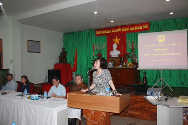 ส่วนสถานทูตเวียดนามประจำประเทศไทยก็ได้จัดการเสวนาเกี่ยวกับการแก้ไขรัฐธรรมนูญปี ๑๙๙๒ ฉบับแก้ไขเพื่อรับฟังความคิดเห็นของชมรมชาวเวียดนามที่อาศัย ทำงานและศึกษาในประเทศไทยรวมทั้งชาวเวียดนามที่อาศัยในประเทศไทยด้วย ท่านโง ดึ๊ก ทั้ง เอกอัครราชทูตเวียดนามประจำประเทศไทยได้กล่าวเปิดการเสวนาโดยเห็นว่า การเสวนาจะช่วยให้ชมรมชาวเวียดนามในประเทศไทยเข้าใจความหมายและความสำคัญในการแก้ไขรัฐธรรมนูญของประเทศ รวมถึงแสดงความคิดเห็นต่อกระบวนการแก้ไขเพื่อเปลี่ยนแปลงใหม่ประเทศทั้งด้านการเมือง สังคมและเศรษฐกิจอย่างมั่นคง นาย นิงห์ เวียด ทง เลขาธิการสมาคมชาวเวียดนามที่อาศัยในกรุงเทพฯได้กล่าวถึงความสนใจและสนับสนุนของชาวเวียดนามที่อาศัยในประเทศไทยเกี่ยวกับการแก้ไขรัฐธรรมนูญ อีกทั้งแสดงความเชื่อมั่นในบทบาทการนำของพรรคที่ได้ระบุในรัฐธรรมนูญ ซึ่งสอดคล้องกับสถานการณ์ปัจจุบันและการผสมผสานเข้ากับประชาคมอาเซียน