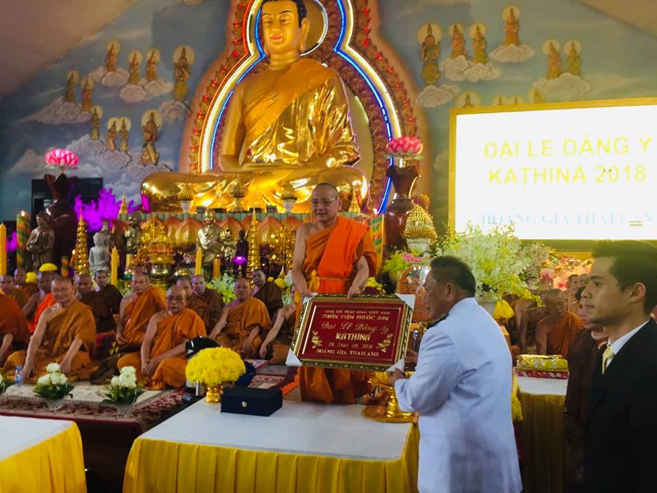 เมื่อวันที่ 18 พฤศจิกายน ณ วัดเฟื้อกเซิน จังหวัดด่งนาย ได้มีการจัดพิธีเชิญผ้าพระกฐินพระราชทานของสมเด็จพระเจ้าอยู่หัวมหาวชิราลงกรณ บดินทรเทพยวรางกูร ไปทอดถวาย โดยมีนางสาววันทนีย์ วิพุธวงศ์สกุล อุปทูตสถานทูตไทย และนางอุรีรัชต์ เจริญโต กงสุลใหญ่ ณ นครโฮจิมินห์ นายประจวบ ไชยสาส์น นายกสมาคมมิตรภาพไทย-เวียดนาม ผู้แทนฝ่ายเวียดนาม ได้แก่ นางเหวียน หว่า เหียบ รองประธานคณะกรรมการประชาชนจังหวัดด่งนาย และนางเล ถิ เหย่า รองหัวหน้าฝ่ายการเงินของพุทธสมาคมเวียดนาม ตัวแทนหน่วยงานภาคเอกชนของไทย และพุทธศาสนิกชนชาวไทยและชาวเวียดนามประมาณ 15,000 คนเข้าร่วม พิธีเชิญผ้าพระกฐินพระราชทานมาทอดถวายที่เวียดนามได้รับการจัดขึ้นเป็นครั้งแรกเมื่อปี 2008 ซึ่งจนถึงปีนี้ ได้มีการจัดพิธีดังกล่าว รวม 14 ครั้ง โดยถือเป็นส่วนหนึ่งของการทำนุบำรุงพระพุทธศาสนาและสืบทอดประเพณีและศาสนพิธีระหว่างไทยกับมิตรประเทศ รวมทั้งสนับสนุนการดำเนินงานด้านการทูตวัฒนธรรมเพื่อกระชับความสัมพันธ์ระหว่างไทยกับเวียดนามทั้งในระดับรัฐบาลและระดับประชาชน