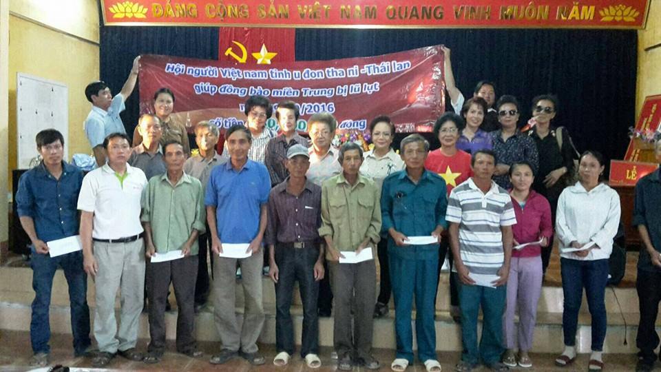 ในระหว่างวันที่ 28 – 29 ตุลาคม สมาคมชาวเวียดนามในประเทศไทยได้จัดคณะไปเยือนและมอบสิ่งของช่วยเหลือให้แก่ผู้ประสบภัยน้ำท่วมในจังหวัดกว๋างบิ่งและจังหวัดห่าติ๊ง ทางภาคกลางเวียดนาม รวมมูลค่าประมาณ 2 พันล้านด่ง โดยเมื่อวันที่ 28 ตุลาคม คณะผู้แทนสมาคมชาวเวียดนามจังหวัดสกลนครนำโดยนาย เหงวียนวันแบ๊อุปนายกสมาคมฯได้มอบสิ่งของช่วยเหลือมูลค่า 265 ล้านด่งให้แก่ผู้ประสบภัยน้ำท่วมในจังหวัดห่าติ๊ง ส่วนคณะผู้แทนสมาคมชาวเวียดนามจังหวัดอุดรธานีและคณะผู้แทนสมาคมชาวเวียดนามจังหวัดเลยได้มอบสิ่งของช่วยเหลือให้แก่ผู้ประสบภัยน้ำท่วมในภาคกลางเช่นกัน