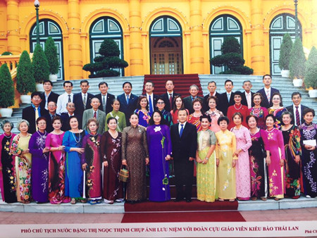 คณะชาวเวียดนามโพ้นทะเลที่เป็นอดีตครูสอนภาษาเวียดนามในประเทศไทยถ่ายรูปกับนางดั๋งถิหงอกถิง รองประธานประเทศเวียดนาม(Photo สมาคมเชื้อสายเวียดนาม อุบลฯ)