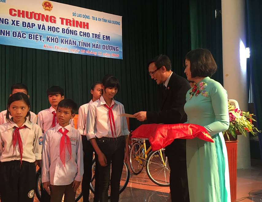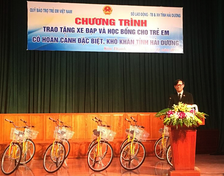 (VOVworld) – เมื่อวันที่ ๑๙ พฤศจิกายน นายมานพชัย วงศ์ภักดี เอกอัครราชทูตไทยประจำเวียดนามได้เป็นผู้แทนคณะกรรมการผู้จัดงานเทศกาลประเทศไทยปี ๒๕๕๘ หรือ Thailand Day 2016 มอบจักรยานจำนวน ๔๐ คันให้แก่เด็กด้อยโอกาสในอำเภอ กีมแถ่ง จังหวัดหายเซือง โดยในพิธีดังกล่าว มีนางด่าว ห่ง ลาน รัฐมนตรีช่วยว่าการกระทรวงแรงงาน ทุพพลภาพ และสวัสดิการสังคม นายเลือก วัน เกิ่ว รองประธานคณะกรรมการประชาชนจังหวัดไฮ่เซือง ตลอดจนผู้แทนจากจังหวัดและประชาชนเดินทางมาร่วมเป็นสักขีพยาน ทั้งนี้ สถานเอกอัครราชทูต ณ กรุงฮานอย ได้นำรายได้จากการจัดงานเทศกาลประเทศไทย ๒๕๕๘ ซึ่งสถานเอกอัครราชทูตฯ ร่วมกับคณะกรรมการทีมประเทศไทยและภาคธุรกิจไทยในเวียดนามจัดขึ้น จำนวน ๗๐ ล้านด่อง มอบให้กับกองทุนเพื่อเด็กเวียดนามแห่งชาติหรือ National Fund for Vietnamese Children (NFVC) เพื่อจัดซื้อจักรยานให้กับเด็กด้อยโอกาสในอำเภอกีม แถ่ง จังหวัดหายเซือง โดยกิจกรรมดังกล่าวเป็นส่วนหนึ่งของกิจกรรมรวมพลังแห่งความภักดีเพื่อถวายแด่พระบาทสมเด็จพระปรมินทรมหาภูมิพลอดลุยเดช อีกด้วย.