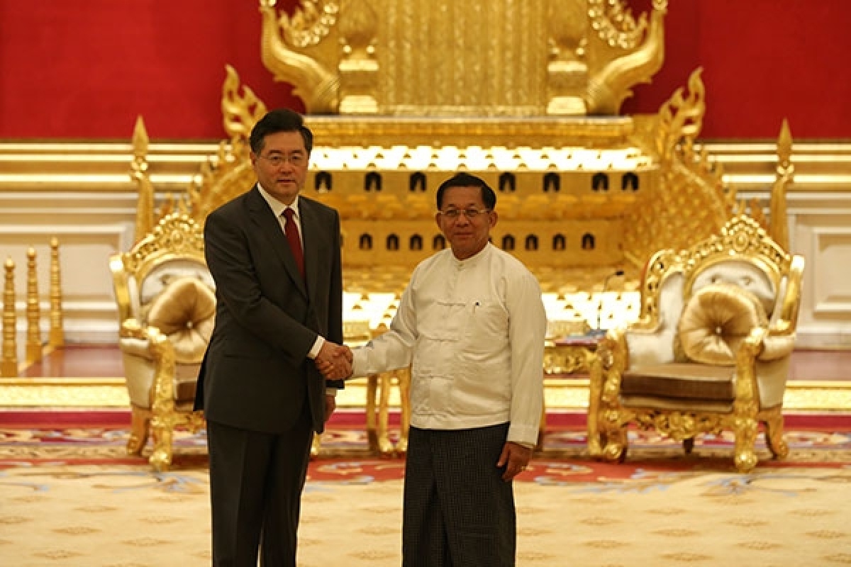 ผู้นำทางทหารของเมียนมาร์ Min Aung Hlaing กับรัฐมนตรีต่างประเทศจีน Qin Gang (ภาพ: กระทรวงการต่างประเทศจีน) |