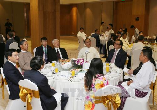 ในการกล่าวปราศรัยในการพบปะ นาย ฝ่ามบิ่งมิงห์ได้ย้ำว่า การเยือนประเทศเมียนมาร์ของเลขาธิการใหญ่พรรคฯได้ประสบความสำเร็จ ทั้งสองฝ่ายได้สถาปนาความสัมพันธ์หุ้นส่วนความร่วมมือในทุกด้าน พัฒนาความสัมพันธ์ระหว่างสองประเทศให้ขึ้นสู่ขั้นสูงใหม่ โดยเฉพาะในด้านเศรษฐกิจ การค้าและการลงทุน เวียดนามได้กลายเป็นหุ้นส่วนการค้ารายใหญ่อันดับ 9 และเป็นนักลงทุนต่างประเทศรายใหญ่อันดับ 7 ของเมียนมาร์ จนถึงต้นปี 2017 เวียดนามมี 59 โครงการลงทุนในเมียนมาร์ รวมยอดเงินจดทะเบียน 1.42 พันล้านดอลลาร์สหรัฐ แต่มูลค่าการค้าต่างตอบแทนบรรลุ 500 ล้านดอลลาร์สหรัฐเท่านั้น ซึ่งแสดงให้เห็นว่า ศักยภาพและจุดแข็งของความร่วมมือด้านเศรษฐกิจระหว่างสองประเทศยังมีอีกมาก โดยเฉพาะในด้านที่ทั้งสองฝ่ายมีจุดแข็ง เช่นธนาคาร การเงิน การบิน โทรคมนาคม แร่ธาตุ การเกษตร ป่าไม้และสัตว์น้ำ เป็นต้น นาย ฝ่ามบิ่งมิงห์ มีความประสงค์ว่า เมียนมาร์จะปรับปรุงบรรยากาศการลงทุน อำนวยความสะดวกเพื่อให้สถานประกอบการเวียดนามลงทุนในเมียนมาร์มากขึ้น