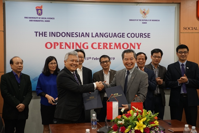 วันที่ 15 กุมภาพันธ์ ณ กรุงฮานอย นาย อีบนู ฮาดี เอกอัครราชทูตอินโดนีเซียประจำเวียดนามและศ. ฝ่ามกวางมิงห์ อธิการบดีมหาวิทยาลัยสังคมศาสตร์และมนุษยศาสตร์สังกัดมหาวิทยาลัยแห่งชาติฮานอยได้ลงนามบันทึกช่วยจำเกี่ยวกับการสอนภาษาอินโดนีเซียในมหาวิทยาลัยสังคมศาสตร์และมนุษยศาสตร์เพื่อมีส่วนร่วมกระชับความสัมพันธ์หุ้นส่วนยุทธศาสตร์ระหว่างอินโดนีเซียกับเวียดนามให้แน่นแฟ้นยิ่งขึ้น