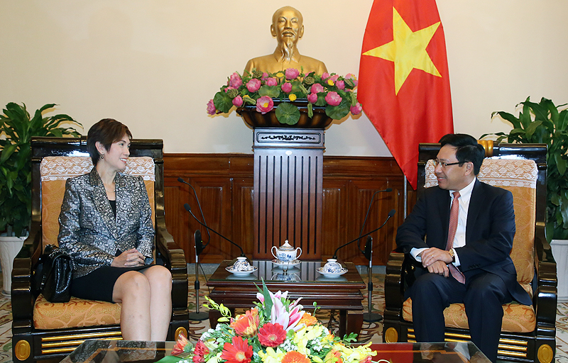 นายฝ่ามบิ่งมิง รองนายกรัฐมนตรีและรัฐมนตรีว่าการกระทรวงการต่างประเทศให้การต้อนรับนาง Joshephine Teo รัฐมนตรีประจำสำนักนายกรัฐมนตรี กระทรวงการต่างประเทศ และกระทรวงคมนาคมสิงคโปร์ (Photo: VGP)