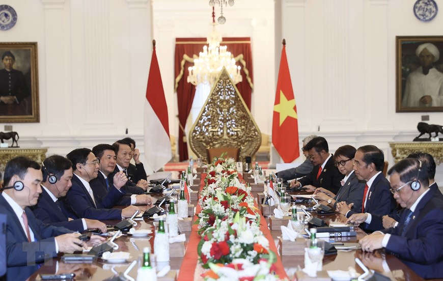ส่วนนาย โจโก วีโดโด ประธานาธิบดีอินโดนีเซีย ได้แสดงความยินดีต่อสถานประกอบการเวียดนาม รวมถึงบริษัท Vinfast ที่เข้ามาลงทุนในอินโดนีเซีย ผลักดันความร่วมมือด้านพลังงานหมุนเวียน ระบบนิเวศน์ยานยนต์ไฟฟ้า พร้อมทั้งเสนอให้ขยายความร่วมมือทางทะเล อาชีพประมงอย่างยั่งยืนและลงนามบันทึกช่วยจำเพื่อความเข้าใจเกี่ยวกับความร่วมมือด้านอาชีพประมงโดยเร็ว