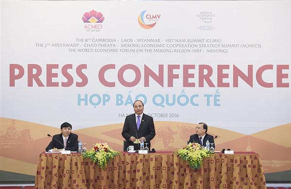 (VOVworld) – บ่ายวันที่ 26 ตุลาคม หลังการจัดกิจกรรมต่างๆในกรอบการประชุมฟอรั่มเศรษฐกิจโลกแม่น้ำโขง การประชุมระดับสูงCLMV8 และการประชุม ACMECS 7 นายกรัฐมนตรีเหงียนซวนฟุ๊กได้เป็นประธานการประชุมแถลงข่าวต่อสื่อมวลชนโดยยืนยันว่า เวียดนามเป็นเจ้าภาพจัด 3 การประชุมดังกล่าวร่วมกันให้ประสบความสำเร็จ โดยในการประชุมฟอรั่มเศรษฐกิจโลกแม่น้ำโขง ความคิดริเริ่มของเวียดนามได้รับคำชื่นชมจากประเทศและหุ้นส่วนพัฒนา โดยทุกฝ่ายได้แสนอแนวทางเกี่ยวกับการขยายตัวที่เป็นมิตรกับสิ่งแวดล้อม การขยายตัวอย่างครอบคลุม พยายามสร้างสรรค์สังคมที่มุ่งสู่ประชาชน รับมือกับการเปลี่ยนแปลงของสภาพภูมิอากาศอย่างทันการณ์ พร้อมทั้งเสนอมาตรการแก้ไขที่เป็นรูปธรรมต่อโครงการระดับภูมิภาคเพื่อสร้างความเชื่อมโยงใน ACMECS และ CLMV ทุกประเทศเห็นว่า ต้องเพิ่มความสัมพันธ์ภายในกลุ่มให้ดีขึ้นพร้อมกับการขยายความสัมพันธ์กับบรรดาประเทศพัฒนาและกลุ่มประเทศนำหน้าในอาเซียน อียู จีนและประเทศอื่นๆที่มาจากความร่วมมือกับหุ้นส่วนพัฒนา เช่น WB และ ADB สำหรับผลการประชุมเหล่านี้ นายกรัฐมนตรีเหงียนซวนฟุ๊กเผยว่า “ที่ประชุมได้หารือเกี่ยวกับมาตรการระดมแหล่งพลังเพื่อการพัฒนาและพัฒนาศักยภาพของภูมิภาคแม่น้ำโขง นอกจากนี้ได้เสนอโอกาสและความท้าทายของการปฏิวัติอุตสาหกรรมครั้งที่ 4 ต่อกระบวนการเปลี่ยนแปลงใหม่เป็นเขตอุตสาหกรรมที่ทันสมัยในภูมิภาคและมาตรการสร้างความเชื่อมโยง ตลอดจนมาตรการขยายความร่วมมือระหว่างรัฐบาลกับชมรมนักธุรกิจ โดยย้ำว่า บรรดาประเทศสมาชิก CLMV มีการพัฒนาช้ากว่าเนื่องจากประวัติศาสตร์และสภาพธรรมชาติที่ลำบาก ดังนั้นต้องการปรับปรุงบรรยากาศการลงทุนให้ดีขึ้นและการประยุกต์ใช้ระบบเศรษฐกิจอิจิตอลให้ทันการณ์เพื่อส่งเสริมศักยภาพและจุดแข็ง โดยเฉพาะในด้านการท่องเที่ยว เทคโนโลยีอินทรีย์ เทคโนโลยีสารสนเทศ”