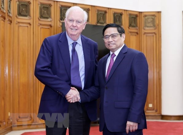 นายกรัฐมนตรี ฝามมิงชิ้งให้การต้อนรับนาย Thomas Vallely ผู้อำนวยการโครงการเวียดนามในมหาวิทยาลัยฮาร์วาร์ด (Photo: TTXVN) |