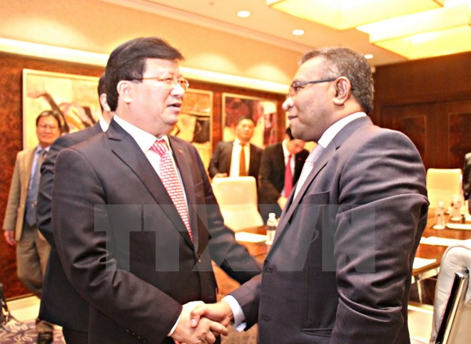 ส่วนในการพบปะกับนาย จูซุฟ คัลลารองประธานาธิบดีอินโดนีเซีย ทั้งสองฝ่ายได้หารือเกี่ยวกับมาตรการพัฒนาความสัมพันธ์หุ้นส่วนยุทธศาสตร์เวียดนาม-อินโดนีเซียให้แน่นแฟ้นมากขึ้น มีส่วนร่วมอย่างแข็งขันในประชาคมอาเซียน ทั้งสองฝ่ายได้เห็นพ้องที่จะจัดการประชุมครั้งที่๗คณะกรรมการผสมเกี่ยวกับความร่วมมือด้านเศรษฐกิจ วิทยาศาสตร์และเทคนิค มุ่งสู่การบรรลุมูลค่าการค้าต่างตอบแทน๑หมื่นล้านดอลลาร์สหรัฐภายในปี๒๐๑๘ ส่วน นาย จูซุฟ คัลลาได้ยืนยันว่า อินโดนีเซียจะร่วมกับเวียดนามและประเทศสมาชิกอาเซียนปฏิบัติแถลงการณ์ของประธานการประชุมผู้นำอาเซียนครั้งที่๒๖และ๒๗เกี่ยวกับปัญหาทะเลตะวันออก ส่งเสริมให้ฝ่ายต่างๆที่เกี่ยวข้องปฏิบัติตามกฎหมายสากล โดยเฉพาะ อนุสัญญาของสหประชาชาติเกี่ยวกับกฎหมายทางทะเลปี๑๙๘๒เพื่อรักษาสันติภาพและเสถียรภาพ ความมั่นคง ความปลอดภัยในการเดินเรือและการบินในทะเลตะวันออก ทั้งสองฝ่ายเห็นว่า ทุกปัญหาการพิพาทในทะเลตะวันออกต้องได้รับการแก้ไขอย่างสันติ ไม่ขู่หรือข่มขู่ที่จะใช้กำลัง มุ่งสู่การจัดทำร่างระเบียบการปฏิบัติต่อกันในทะเลตะวันออกหรือซีโอซีโดยเร็วเพื่อค้ำประกันสันติภาพและเสถียรภาพในภูมิภาค.
