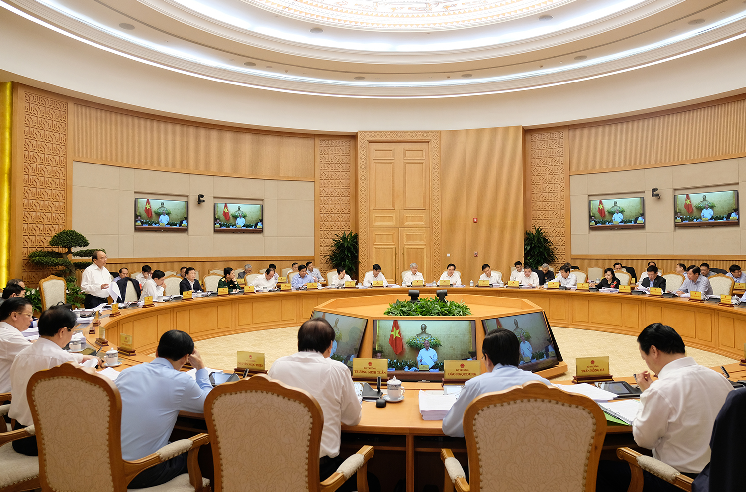 ในการนี้ ท่าน เหงวียนซวนฟุก ได้ประเมินว่า การพัฒนาเศรษฐกิจสังคมในไตรมาสแรกของปีนี้ มีสัญญาณที่น่ายินดีต่างๆ โดยอัตราการขยายตัวจีดีพีอยู่ที่ร้อยละ 7.38 ซึ่งสูงที่สุดในรอบ 10ปีที่ผ่านมา ควบคู่กันนั้น เวียดนามได้ลงนามในข้อตกลงหุ้นส่วนในทุกด้านและก้าวหน้าภาคพื้นแปซิฟิกหรือCPTPP โดยเฉพาะเวียดนามได้ประสบความสำเร็จในการจัดการประชุมผู้นำประเทศในเขตอนุภูมิภาคแม่น้ำโขงขยายวงหรือGMS ครั้งที่ 6 และการประชุมผู้นำความร่วมมือเขตสามเหลี่ยมพัฒนากัมพูชา ลาวและเวียดนามหรือ CLV ครั้งที่ 10 ด้วยความคิดริเริ่มต่างๆ ซึ่งช่วยยกระดับบทบาทและชื่อเสียงของเวียดนามให้สูงเด่นมากขึ้นบนเวทีโลก พร้อมทั้งเผยว่า หนังสือพิมพ์ NIKKEI ของญี่ปุ่นฉบับวันที่ 2 เมษายนรายงานว่า ดัชนีผู้จัดการฝ่ายจัดซื้อหรือ PMI ของเวียดนามอยู่ที่ 51.6 จุดและเวียดนามเป็นหนึ่งใน 2 ประเทศในเอเชียตะวันออกเฉียงใต้ที่มีดัชนี PMI สูงกว่า 50 จุดในสภาวการณ์ที่ดัชนี PMI ของประเทศอื่นๆลดลง ส่วนบรรยากาศการลงทุนประกอบธุรกิจของเวียดนามได้รับการปรับปรุงอย่างต่อเนื่อง นายกรัฐมนตรี เหงวียนซวนฟุก ได้กำชับให้สมาชิกรัฐบาลแสดงความคิดเห็นต่อแผนพัฒนาเศรษฐกิจสังคมในปี 2018 ให้อยู่ที่อย่างน้อยร้อยละ 6.7 ซึ่งสูงกว่าเป้าหมายที่สภาแห่งชาติได้วางไว้ คือร้อยละ 6.5 “รองนายกรัฐมนตรีเวืองดิ่งเหวะและจิ่งดิ่งหยุงต้องประชุมเพื่อประเมินศักยภาพการผลิตและประกอบธุรกิจของเครือบริษัทและกลุ่มบริษัทต่างๆ พร้อมทั้งวางแผนการพัฒนาบริษัทเหล่านี้เพื่อค้ำประกันการบรรลุอัตราการขยายตัวในปี 2018 สภาแห่งชาติได้ตั้งเป้าหมายว่า จะบรรลุอัตราการขยายตัวในปี 2018 ให้อยู่ที่ตั้งแต่ร้อยละ 6.5 - 6.7 ตอนนี้ เราได้ย่างเข้าสู่ไตรมาสที่ 2 แล้ว ผมเสนอให้พยายามบรรุอัตราการขยายตัวอย่างน้อยที่ร้อยละ 6.7 และต้องกำหนดเป้าหมายให้แก่หน่วยงานที่เกี่ยวข้อง”