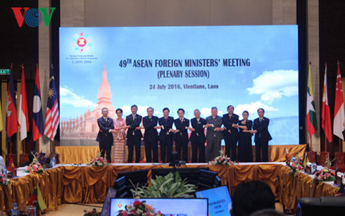 (VOVworld) – ในกรอบการประชุมรัฐมนตรีต่างประเทศอาเซียนหรือเอเอ็มเอ็มครั้งที่ 49 ณ ประเทศลาว เมื่อวันที่ 24 กรกฎาคม บรรดารัฐมนตรีต่างประเทศอาเซียนได้ออกปฏิญญาเอเอ็มเอ็ม 49 และได้มีการประกาศปฏิญญานี้ในวันที่ 25 กรกฎาคม โดยกล่าวถึงปัญหาต่างๆ เช่นเศรษฐกิจ สังคม การเมืองและความมั่นคง และได้มีส่วนที่เฉพาะเจาะจงเกี่ยวกับทะเลตะวันออก โดยแสดงความวิตกกังวลเกี่ยวกับการเคลื่อนไหวในทะเลตะวันออกเมื่อเร็วๆนี้และปัจจุบัน ซึ่งยืนยันถึงความสำคัญของการธำรงและผลักดันสันติภาพ ความมั่นคง เสถียรภาพ ความปลอดภัยและเสรีภาพในการเดินเรือและการบินในภูมิภาคในทะเลตะวันออก ยืนยันอีกครั้งถึงความจำเป็นของการผลักดันความไว้วางใจระหว่างกัน การใช้ความอดกลั้น ไม่มีปฏิบัติการที่ทำให้สถานการณ์มีความซับซ้อนมากขึ้นและยืนหยัดปฏิบัติมาตรการที่สันติในการแก้ไขการพิพาทตามกฎหมายสากล รวมทั้งอนุสัญญาของสหประชาชาติเกี่ยวกับกฎหมายทางทะเลปี 1982 ปฏิญญายังย้ำถึงความสำคัญของการไม่มีปฏิบัติการทางทหารและการใช้ความอดกลั้นในการปฏิบัติทุกกิจกรรม รวมทั้งการเปลี่ยนแปลงสภาพเดิมที่อาจทำให้สถานการณ์ในทะเลตะวันออกทวีความตึงเครียดมากขึ้น การปฏิบัติแถลงการณ์เกี่ยวกับการปฏิบัติต่อกันของทุกฝ่ายในทะเลตะวันออกหรือดีโอซีอย่างสมบูรณ์และมีประสิทธิภาพ เร่งรัดให้ทุกฝ่ายจัดทำร่างระเบียบการปฏิบัติต่อกันในทะเลตะวันออกหรือซีโอซีโดยเร็ว รวมทั้งการผลักดันการพบปะเป็นประจำของเจ้าหน้าที่อาเซียนและจีน และการพบปะของกลุ่มปฏิบัติงานร่วมเกี่ยวกับการปฏิบัติดีโอซี.