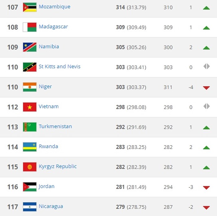 สำหรับทีมฟุตบอลเวียดนาม มี1220คะแนน อยู่อันดับที่ 102 ของโลก อันดับ17 ของเอเชียและอันดับหนึ่งในเอเชียตะวันออกเฉียงใต้.