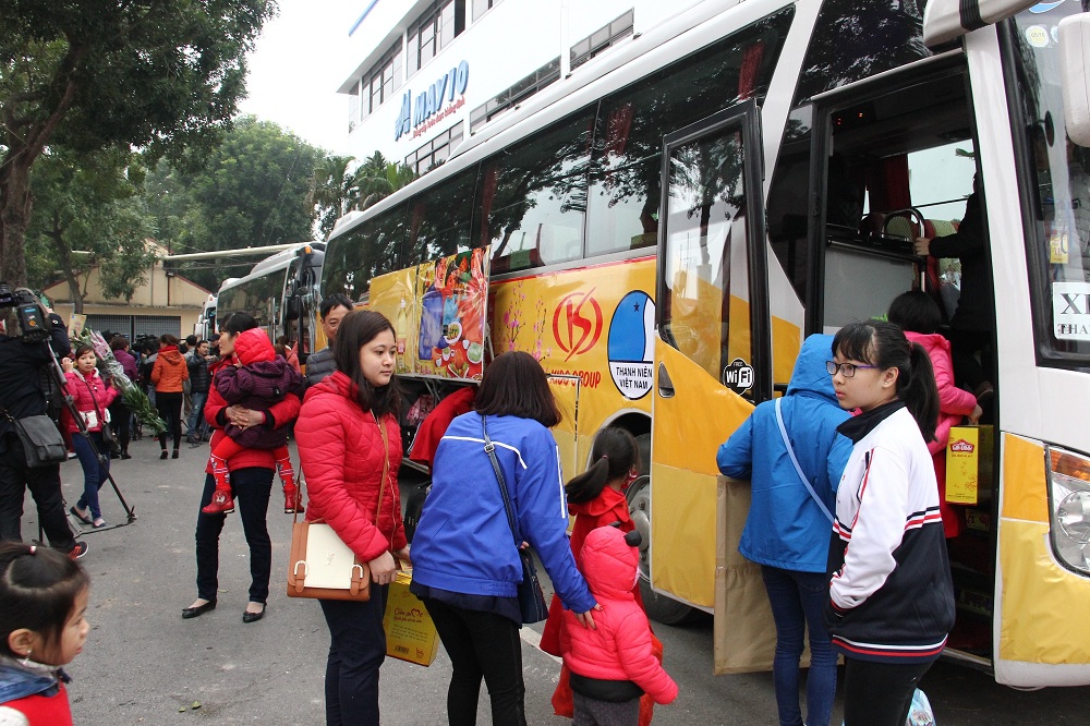 (VOVworld) – เมื่อเช้าวันที่ 6 กุมภาพันธ์ สหพันธ์แรงงานสาขากรุงฮานอยได้จัดขบวนรถโดยสารฟรี 100 คันเพื่อส่งแรงงาน 4,000 คนกลับภูมิลำเนาต้อนรับตรุษเต๊ต ในการนี้ นางฉิ่งเฟืองมาย พื้นเพที่จังหวัดห่าติ๋ง กรรมกรของบริษัท Yamaha กล่าวด้วยความยินดีว่า “ดิฉันรู้สึกมีความสุขและรอคอยถึงวันได้กลับเพื่อต้อนรับตรุษเต๊ตกับครอบครัว เมื่อตรุษเต๊ตปีที่แล้ว ดิฉันยากจะขึ้นรถโดยสารเพื่อกลับบ้านเกิดได้และเงินซื้อตั๋วรถก็ไม่พอ ปีนี้ ทางบริษัทได้ให้การช่วยเหลือพวกเราผ่านการจัดรถส่งกลับบ้าน เรามีความยินดีมาก ขอขอบคุณผู้บริหารที่ได้อำนวยความสะดวกให้แก่พวกเรา”