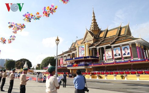 ในการกล่าวปราศรัยต่อประชาชนนับหมื่นคน พระบาทสมเด็จพระบรมนาถ นโรดม สีหมุนี กษัตริย์แห่งกัมพูชาและสมเด็จฮุนเซน นายกรัฐมนตรีได้แสดงความสำนึกในบุญคุณของผู้ที่ได้สละชีพรุ่นแล้วรุ่นเล่าเพื่อปกป้องเอกราชและเสรีภาพของประเทศ ขอบคุณกองกำลังติดอาวุธและประชาชนกัมพูชาได้พยายามร่วมกับรัฐบาลธำรงสันติภาพ เสถียรภาพและความเป็นระเบียบเรียบร้อยทางสังคม พร้อมทั้งให้คำมั่นว่า จะพยายามมากขึ้นเพื่อผลักดันความเจริญรุ่งเรือง นำความก้าวหน้ามาสู่ประชาชนและประเทศกัมพูชา พร้อมทั้งเรียกร้องให้ประชาชนสามัคคีกันปฏิบัติตามกฎหมายและรัฐธรรมนูญ ร่วมกันปกป้องและสร้างสรรค์ประเทศกัมพูชาที่เข้มแข็งและเจริญรุ่งเรือง