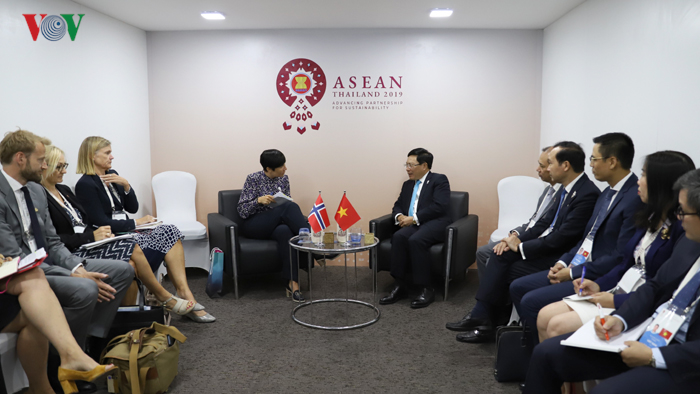 ส่วนในการพบปะกับรัฐมนตรีต่างประเทศนอร์เวย์ ทั้งสองฝ่ายได้เห็นพ้องผลักดันการเจรจาข้อตกลงการค้าเสรีระหว่างเวียดนามกับกลุ่มการค้าเสรียุโรปหรืออีเอฟทีเอ โดยรัฐมนตรีต่างประเทศนอร์เวย์ได้ยืนยันว่า เวียดนามคือตลาดและหุ้นส่วนสำคัญของนอร์เวย์ สถานประกอบการนอร์เวย์มีความประสงค์ขยายการลงทุนและประกอบธุรกิจในเวียดนาม