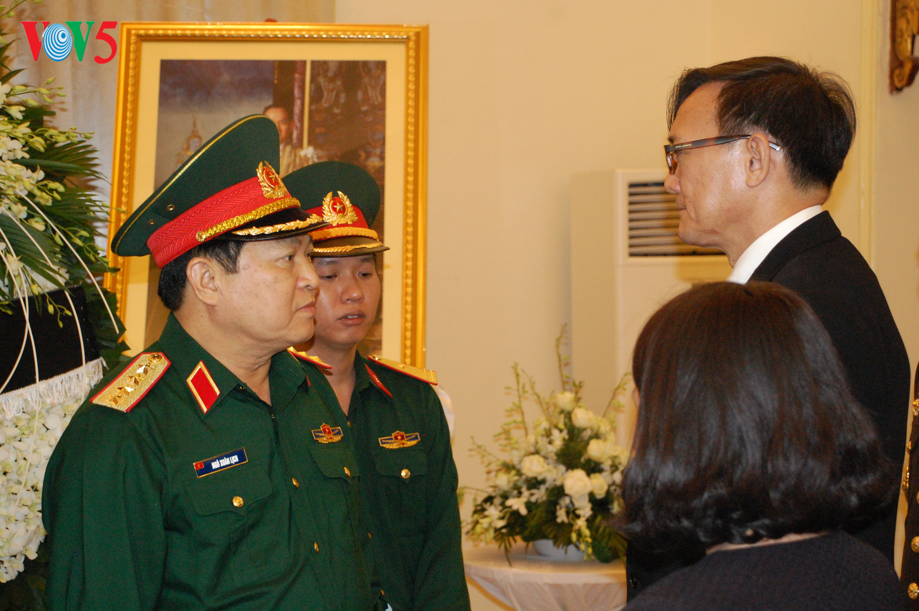 ในบ่ายวันเดียกัน คณะผู้แทนระดับสูงของกระทรวงกลาโหมเวียดนามนำโดยพลเอก โงซวนหลิก รัฐมนตรีว่าการกระทรวงกลาโหมได้เดินทางมาถวายอาลัยพระบาทสมเด็จปรมินทรมหาภูมิพลอดุลยเดช โดยแสดงความเสียใจอย่างสุดซึ้งต่อพระบรมวงศานุวงศ์ รัฐบาล และประชาชนชาวไทย อีกทั้งแสดงความเคารพต่อพระอัจฉริยะภาพของพระบาทสมเด็จปรมินทรมหาภูมิพลอดุลยเดชในด้านการทูตที่มีต่อความสัมพันธ์มิตรภาพและความสัมพันธ์หุ้นส่วนยุทธศาสตร์ระหว่างสองประเทศ รวมทั้งความร่วมมือด้านกลาโหม นอกจากนี้ ตัวแทนจากสถานทูตสหรัฐอเมริกา ฝรั่งเศส และสวีเดนประจำเวียดนามก็ได้เดินทางมายังสถานทูตไทยประจำเวียดนามในกรุงฮานอยเพื่อถวายพวงมาลาและลงนามถวายความอาลัยเช่นกัน