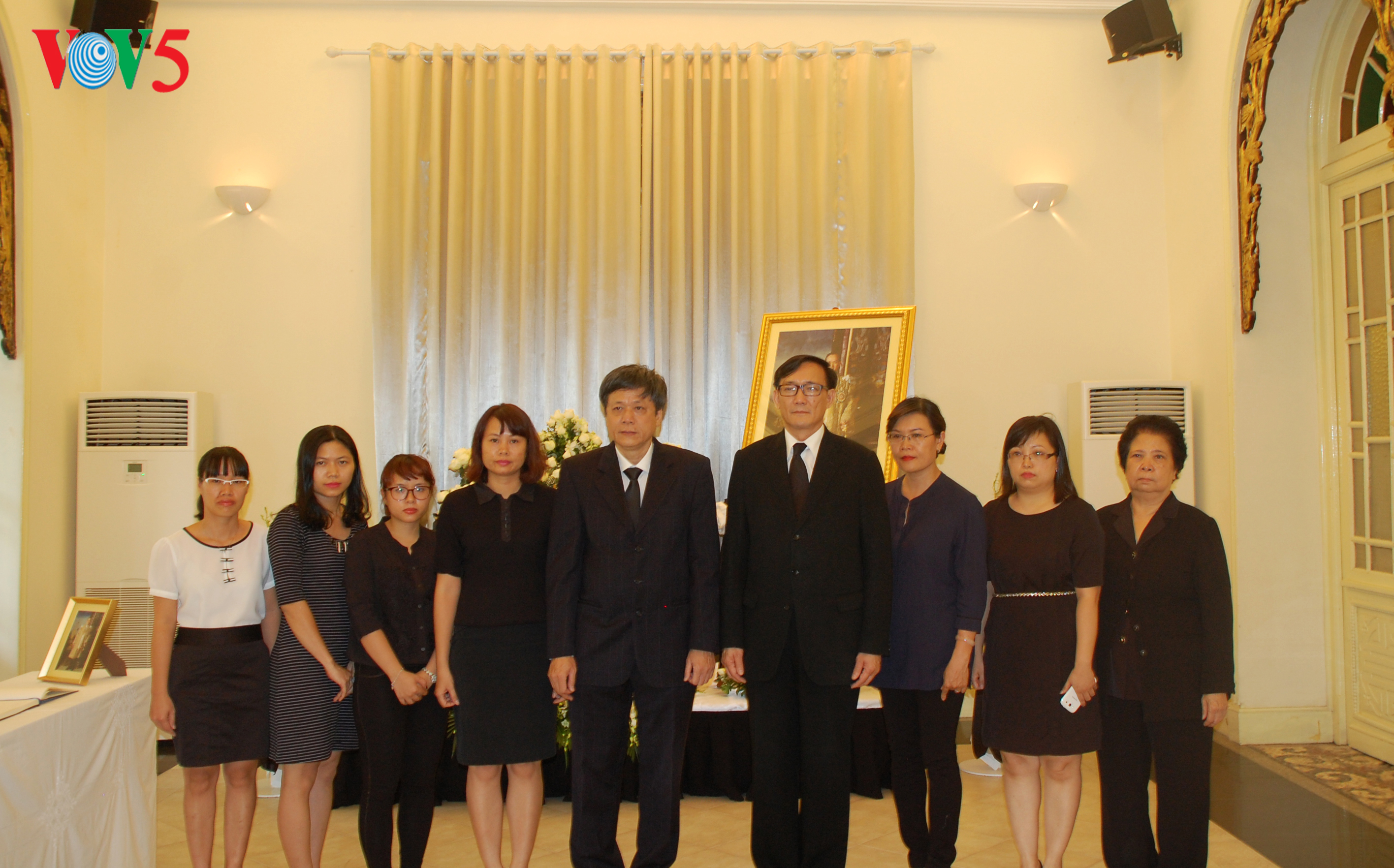 ![]() นาย หวูหาย รองประธานสถานีวิทยุเวียดนามและบรรดาผู้สื่อข่าวภาคภาษาไทย ส่วนกระจายเสียงต่างประเทศของสถานีวิทยุเวียดนามถวายอาลัยพระบาทสมเด็จพระเจ้าอยู่หัว