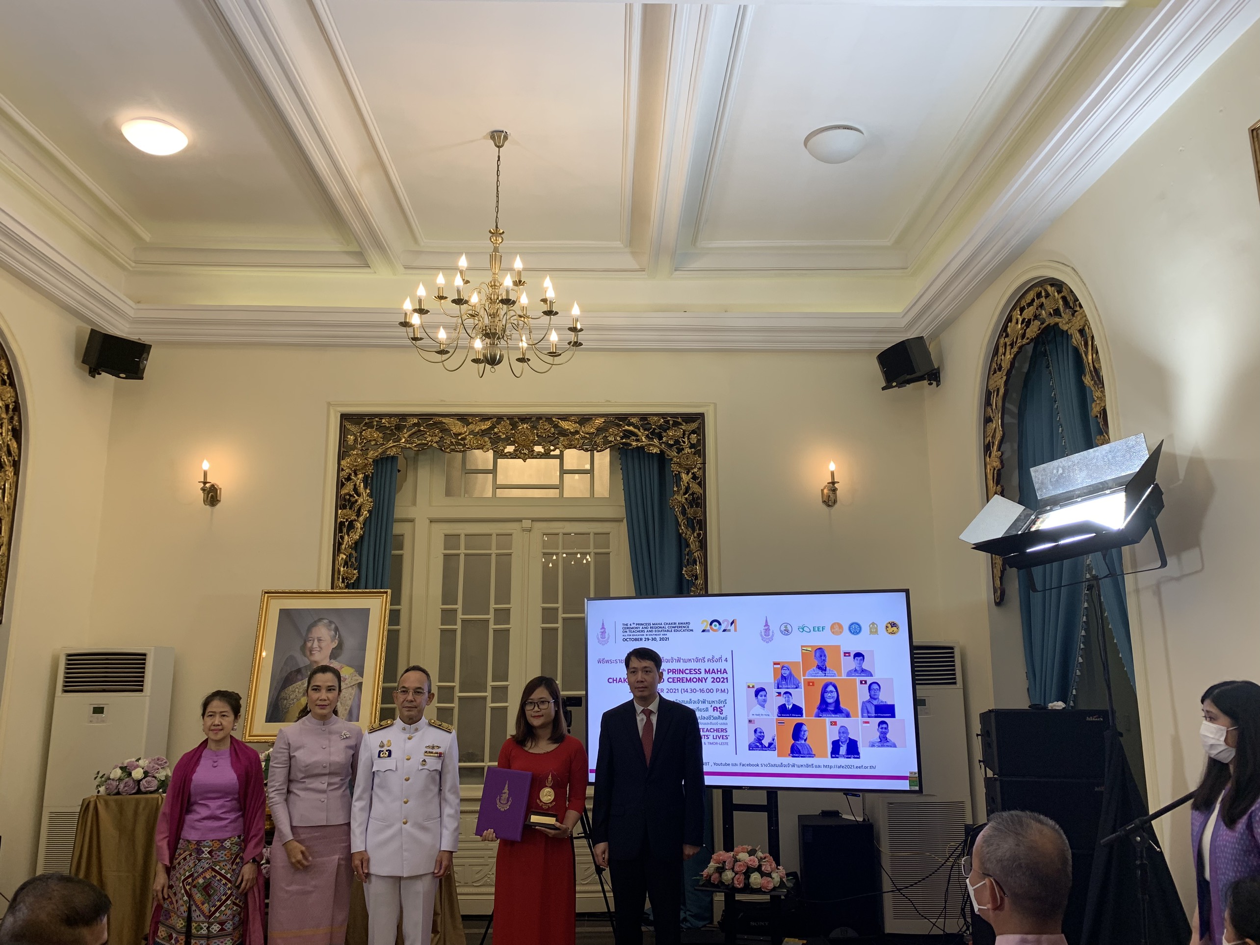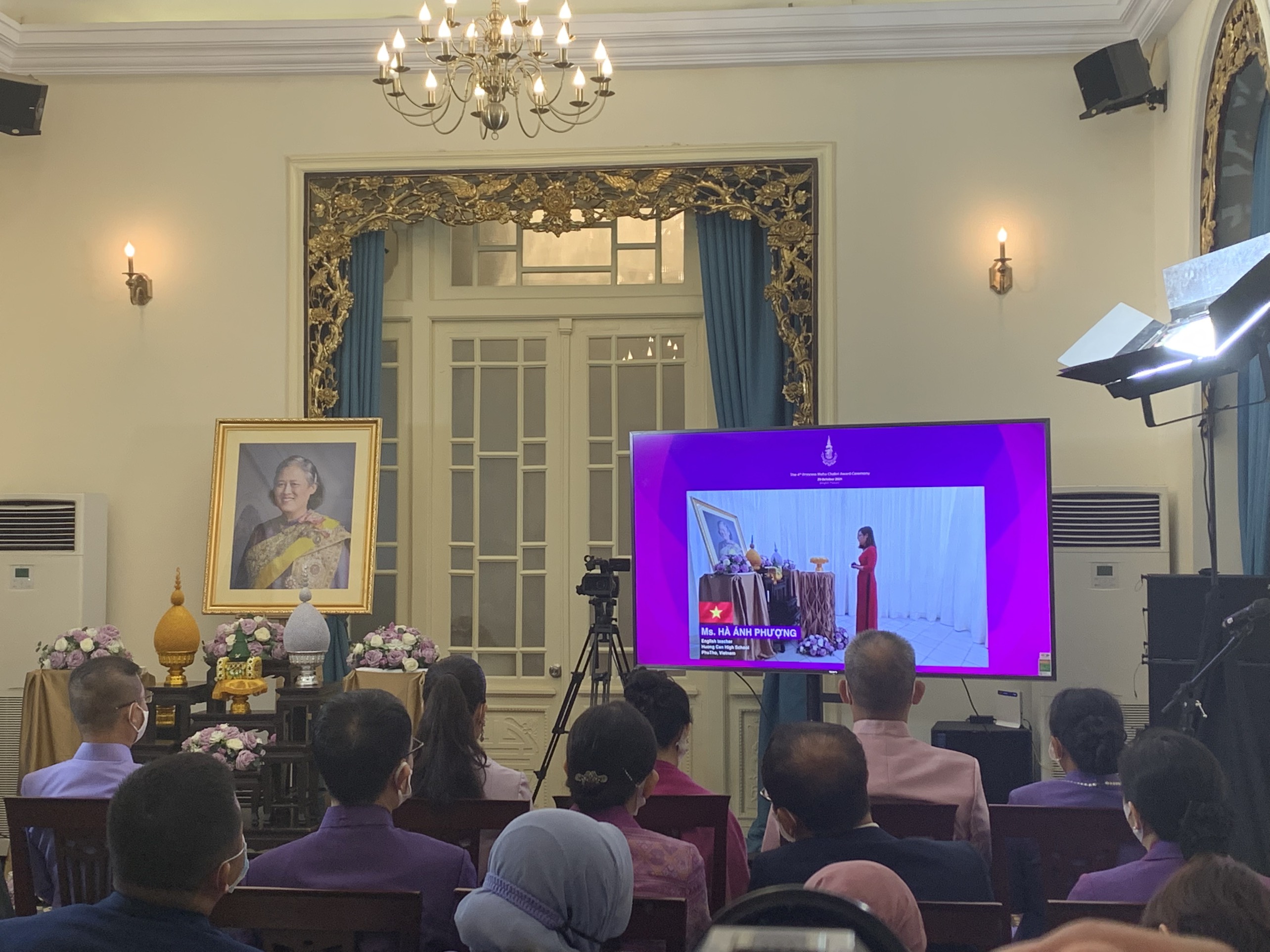 โดยพิธีมอบรางวัลที่กรุงฮานอยมีนาย นิกรเดช พลางกูร เอกอัครราชทูตไทย ณ กรุงฮานอย ตัวแทนของกระทรวงศึกษาและฝึกอบรมเวียดนาม แขกผู้ที่มีเกียรติและนาง ห่าแอ๊งเฝื่อง ครูสอนภาษาอังกฤษในโรงเรียนมัธยมศึกษาเฮืองเกิ่น อำเภอแทงเซิน จังหวัดฟู้เถาะ ที่ได้รับเลือกเข้ารับรางวัลสมเด็จเจ้าฟ้ามหาจักรีประจำปี2021 เข้าร่วมงาน ในการกล่าวปราศรัยในพิธี นายนิกรเดช พลางกูร เอกอัครราชทูตไทย ณ กรุงฮานอย ได้เผยว่า