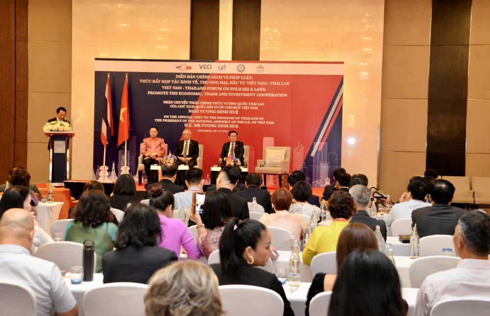 บ่ายวันเดียวกัน ประธานสภาแห่งชาติ เวืองดิ่งเหวะ ได้เข้าร่วมฟอรั่มนโยบายและกฎหมายเพื่อส่งเสริมความร่วมมือด้านเศรษฐกิจ การค้าและการลงทุนเวียดนาม – ไทย โดยได้เผยว่า ทั้งสองประเทศสามารถผลักดันความร่วมมือด้านการค้าข้าว รถยนต์ไฟฟ้า อุตสากรรมเซมิคอนดักเตอร์ พร้อมทั้งระบุถึงแนวทางการขยายความร่วมมือระหว่างรัฐสภาและรัฐบาลทั้งสองประเทศในการแลกเปลี่ยนประสบการณ์ในการจัดทำนโยบายและกฎหมายเกี่ยวกับสถานประกอบการ การปรับตัวเข้ากับการพัฒนาวิทยาศาสตร์เทคโนโลยีและสถานการณ์โลกและเสนอให้ทั้งสองประเทศผลักดันกลไกความร่วมมือเพื่อเอื้อให้แก่การแลกเปลี่ยนการค้า การลงทุน ปฏิบัติข้อตกลงการค้าเสรีที่ไทยและเวียดนามเป็นภาคี พยายามประสานงานและทาบทามความคิดเห็นเกี่ยวกับกลไกความร่วมมือระหว่างสถานประกอบการ.