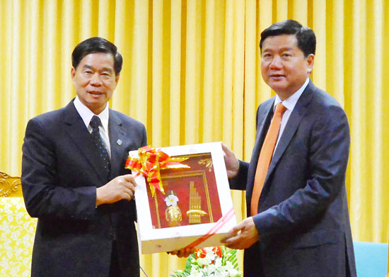 ![]() นาย สินละวง คุดไพทูน เลขาธิการพรรคและผู้ว่าการนครหลวงเวียงจันทน์และนาย ดิงลาทัง เลขาธิการพรรคสาขานครโฮจิมินห์