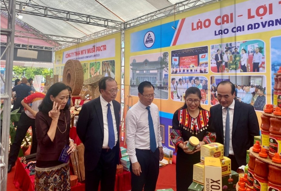 นาย เหงวียนวันแถ่ง ประธานสมาคมมิตรภาพเวียดนาม-ไทย (คนที่ 2 จากซ้าย) นางสาวอุรวดี ศรีภิรมย์ เอกอัครราชทูต ณ กรุงฮานอยและนาย หวูซวนเกื่อง รองเลขาธิการพรรคสาขาและประธานสภาประชาชนจังหวัดลาวกาย(คนที่ 3 จากซ้าย) เยี่ยมชมบูธของจังหวัดลาวกาย (https://thoidai.com.vn/) |