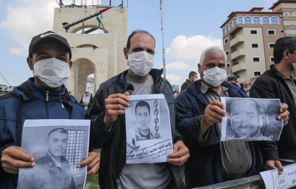 ชาวปาเลสไตน์ถือภาพเชลยศึกที่ถูกอิสราเอลจับกุม |