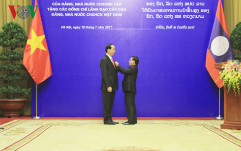 บ่ายวันที่ 18 กรกฎาคม ณ กรุงฮานอย พรรคและรัฐลาวได้จัดพิธีมอบเหรียญอิสริยาภรณ์ทองแห่งชาติ ซึ่งเป็นเหรียญอันสูงส่งของพรรคและรัฐลาวให้แก่ผู้นำพรรคและรัฐเวียดนาม ประกอบด้วย ท่านเจิ่นด่ายกวาง ประธานประเทศ ท่านเหงียนซวนฟุ๊ก นายกรัฐมนตรีและนางเหงียนถิกิมเงิน ประธานรัฐสภาเวียดนาม พร้อมทั้งมอบเหรียญอิสริยาภรณ์เสรีภาพชั้นหนึ่งให้แก่ผู้นำส่วนกลาง กระทรวงกลาโหม กระทรวงรักษาความมั่นคงทั่วไป ผู้บริหารกรุงฮานอยและผู้บริหารนครโฮจิมินห์