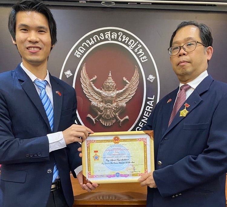 นายอภิรัตน์ สุคนธาภิรมย์ ณ พัทลุง กงสุลใหญ่ไทย ณ นครโฮจิมินห์รับเข็มที่ระลึก “เพื่อสันติภาพและมิตรภาพระหว่างประชาชาติ” (thoidai.com.vn) |