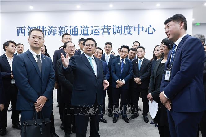 นายกรัฐมนตรี ฝ่ามมิงชิ้ง เยือนศูนย์โลจิสติกส์ฉงชิ่ง ประเทศจีน (Photo: TTXVN) |