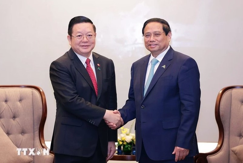 นาย ฝ่ามมิงชิ้ง นายกรัฐมนตรีเวียดนามให้การต้อนรับนาย เก้า กึม ฮอน เลขาธิการอาเซียน (Photo: TTXVN) |