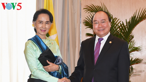 ในวันเดียวกัน นายกรัฐมนตรีเวียดนามได้มีการพบปะกับนาง ออง ซาน ซูจี หัวหน้าคณะผู้แทนเมียนมาร์ที่เข้าร่วมการประชุมผู้นำอาเซียน โดยทั้งสองฝ่ายได้เห็นพ้องที่จะส่งเสริมการเจรจาเพื่อมุ่งสู่การลงนามข้อตกลงความร่วมมือในด้านที่มีศักยภาพ เช่น การค้า การลงทุนคมนาคมขนส่ง การเงิน เป็นต้น
